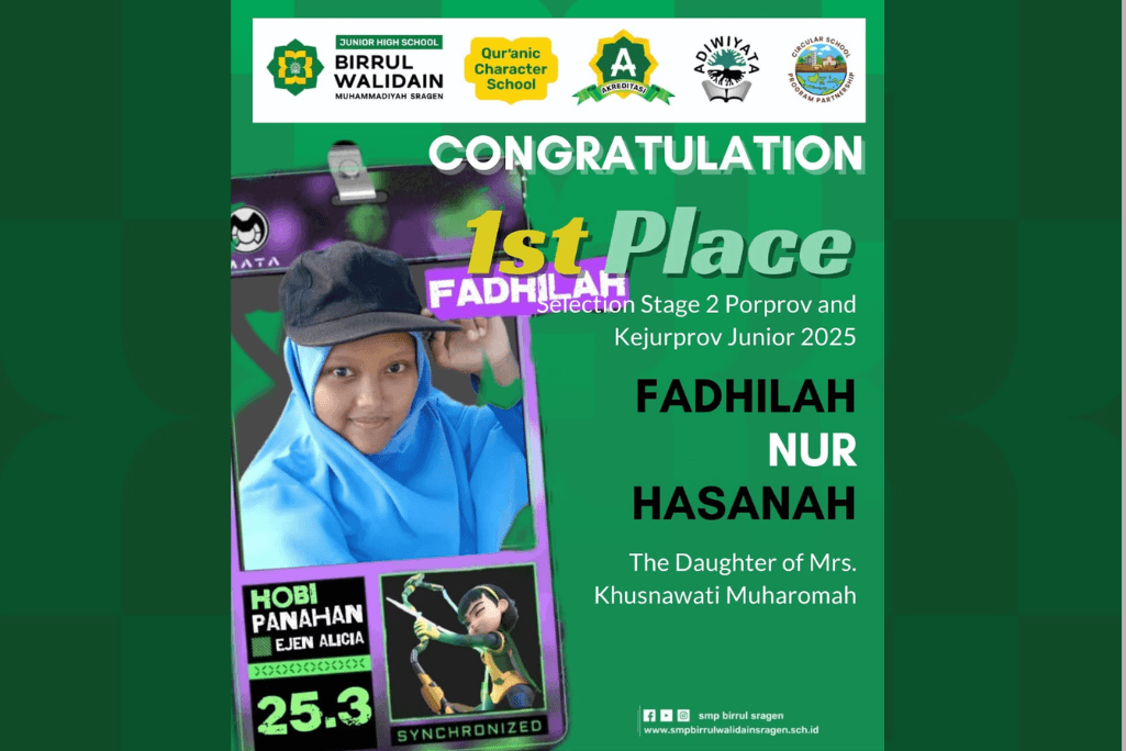 Alhamdulillah, barakallah, another proud achievement has been attained by a student of SMP Birrul Walidain Muhammadiyah Sragen. Congratulations to Fadhilah Nur Hasanah, daughter of Alm. Mrs. Khusnawati Muharomah, a 7B grade student, who successfully won 1st Place in Selection Stage 2 of Porprov and Kejurprov at the 2025 Junior Provincial Championship (Kejurprov) at the District Level.