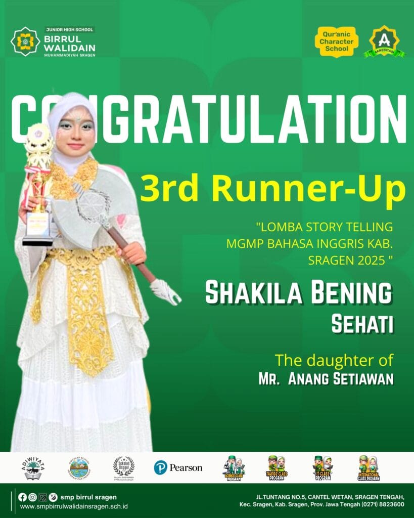 ✨ Congrats to *Shakila Bening Sehati 🌼 (Grade 7C), daughter of Mr. Anang Setiawan, for winning 🥉 *3rd Runner-Up* in the English MGMP Storytelling Competition of Sragen Regency 2025!