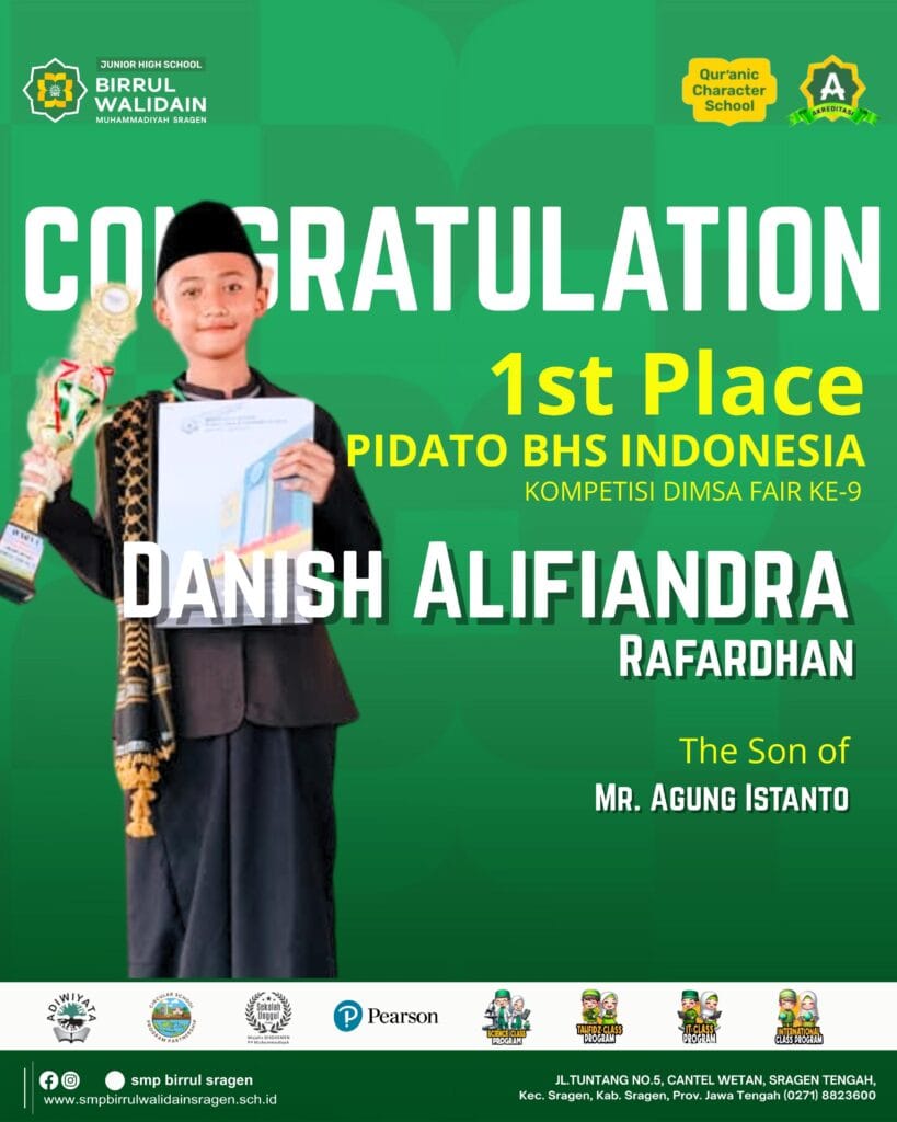- Danish Alifiandra Rafardhan, β (Grade 7F), son of Mr. Agung Istanto, for winning π₯ 1st Place in Indonesian Speech Contest at the 9th Dimsa Fair in 2025. https://vt.tiktok.com/ZSUKfK7Vj/