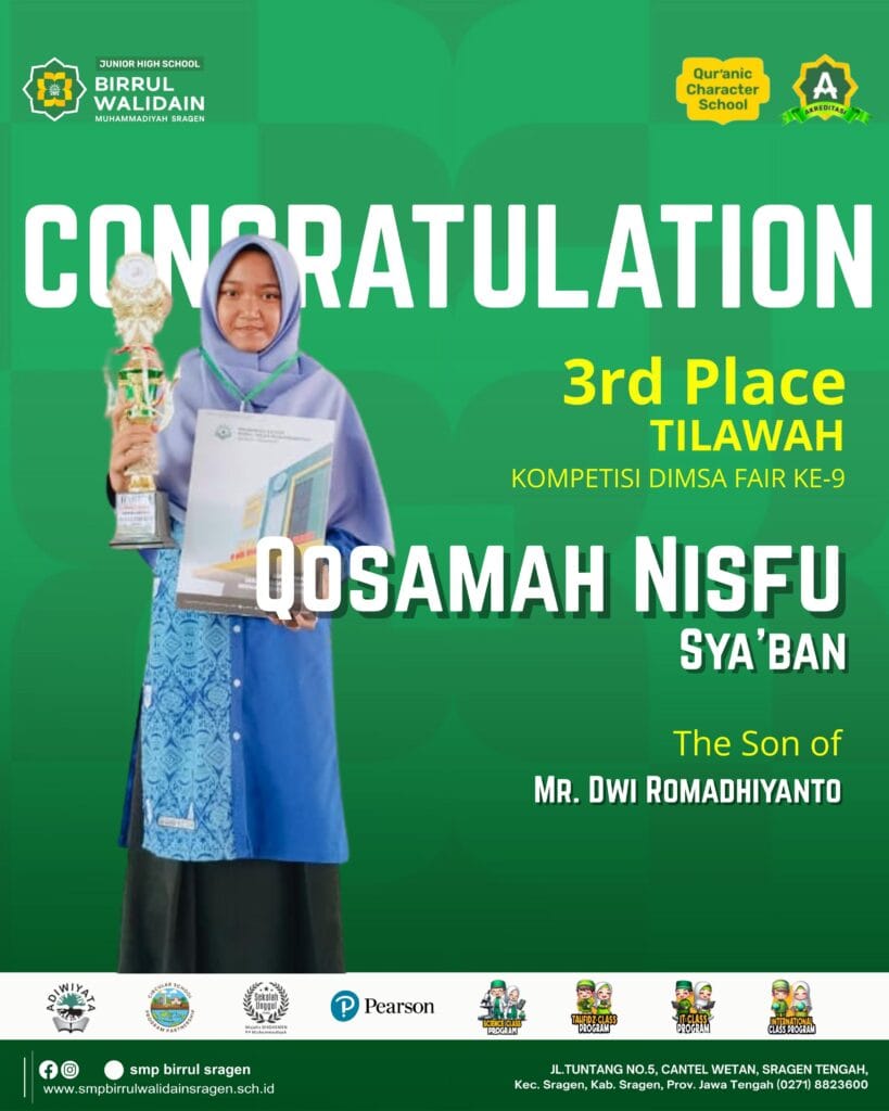 - Qosamah Nisfu Sya’banπΈ (Grade 7B) daughter of Mr. Dwi Romadhiyanto, just won π₯ 3rd Place in the Tilawah Competition at the 9th Dimsa Fair in 2025. https://vt.tiktok.com/ZSUKPr8xR/