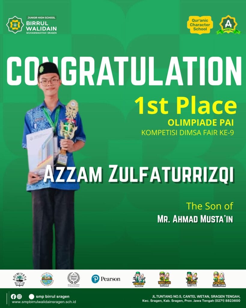 - Azzam Zulfaturrizqi, β (Grade 8E), son of Mr. Ahmad Musta’in, for winning π₯ 1st Place in Islamic Olympiad at the 9th Dimsa Fair in 2025. https://vt.tiktok.com/ZSUKPRTRS/